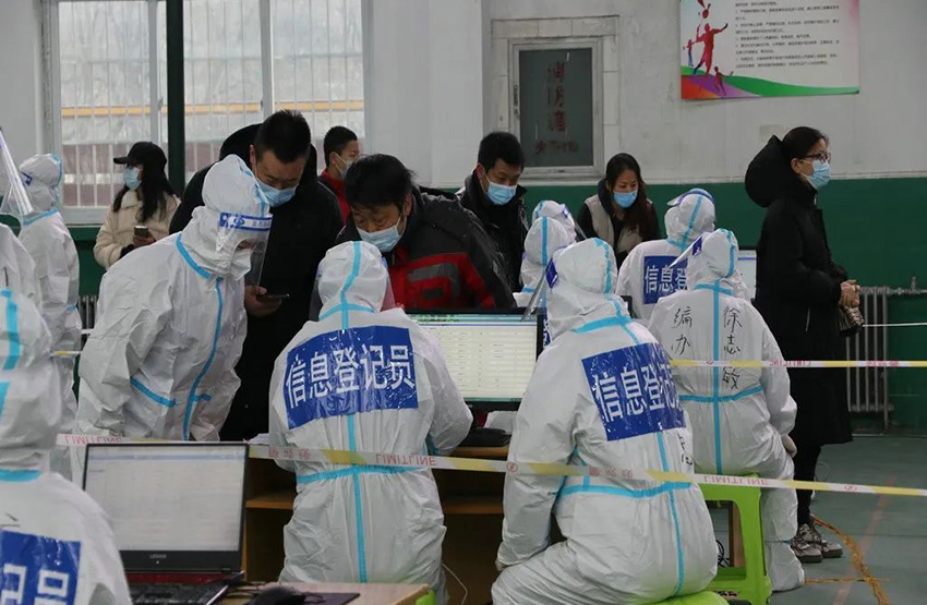 负责信息采集志愿者,向前来进行核酸检测的人们详细讲解操作流程,耐心细致的态度和严谨的作风,赢得了在场群众的一致好评。有的同学负责录信息,他们仔细核对信息进行录入,不允许有一丝差错。虽然同学们都是第一次作为志愿者参与核酸检测工作,但大家配合默契、工作效率高,核酸检测工作进行的非常顺利。